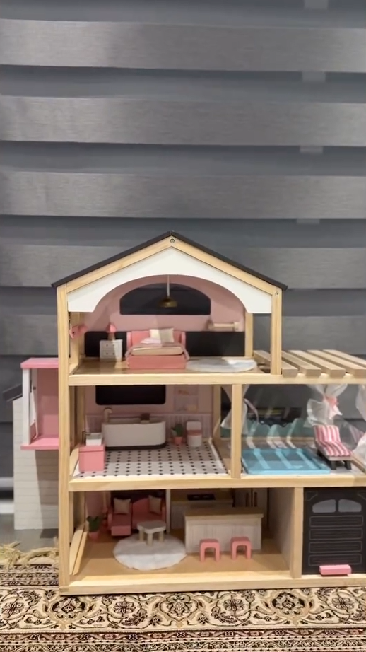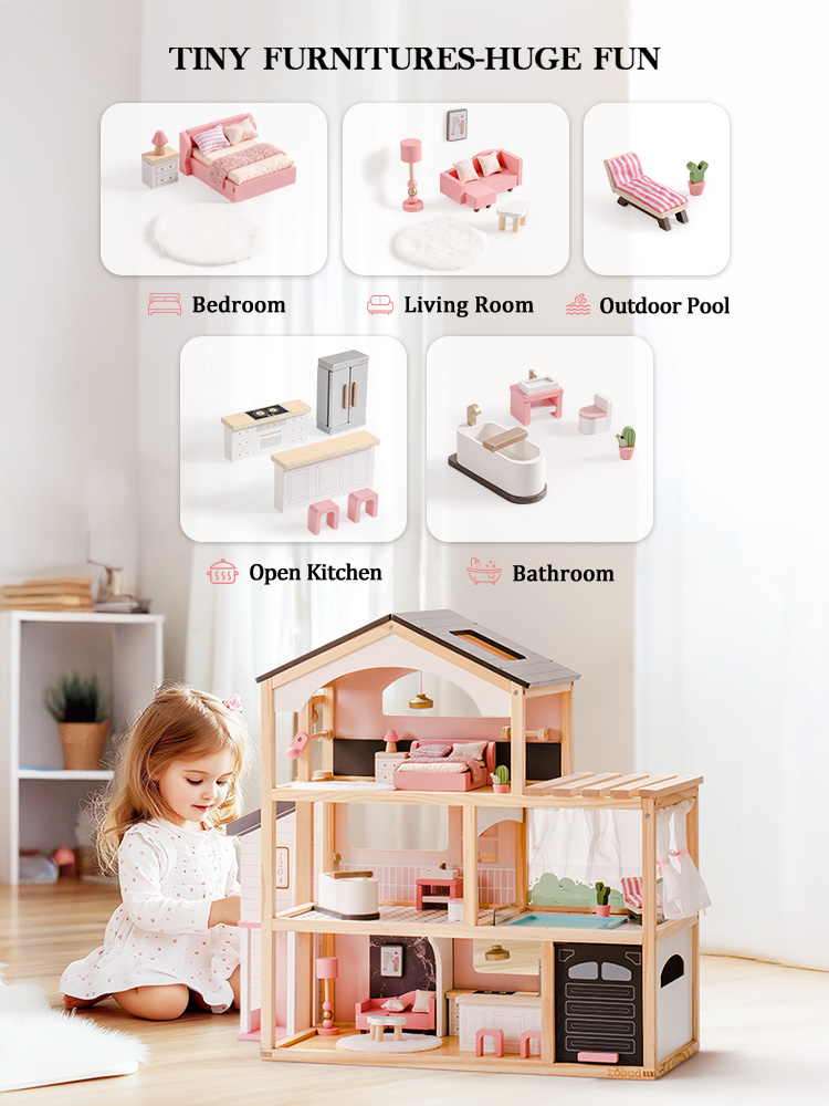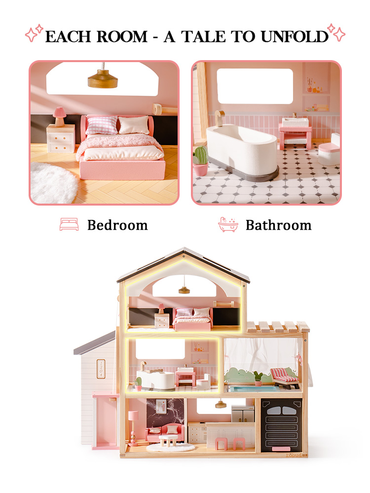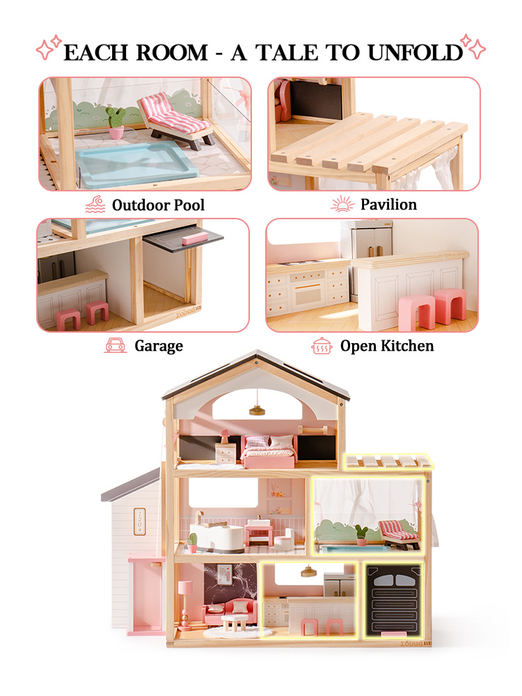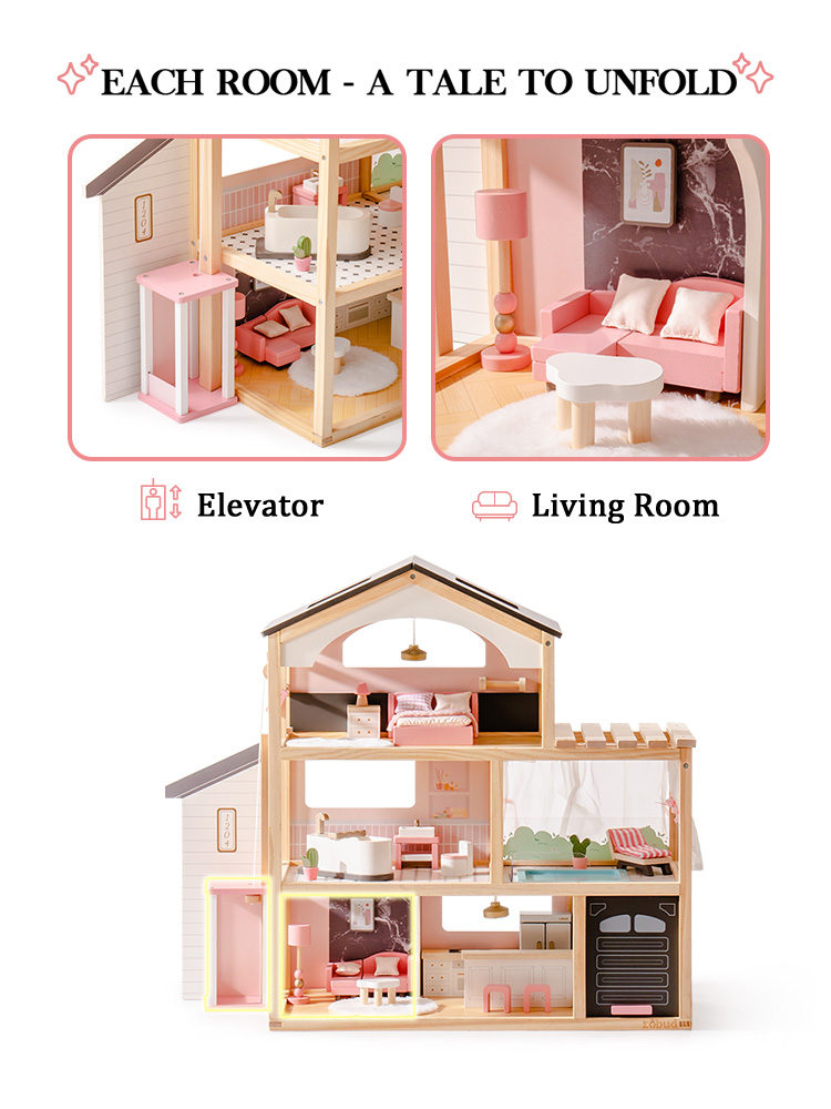 Paese delle meraviglie a tre livelli: La casa delle bambole è dotata di un ascensore funzionante e di un design a tre livelli con sei stanze, tra cui una camera da letto elegante e accogliente, un adorabile bagno, una comoda piscina, un soggiorno squisito, una cucina aperta e un garage. Questo allestimento completo abbraccia vari aspetti della vita quotidiana, ricreando scene di vita realistica. Attraverso il gioco, accende l'immaginazione infinita dei bambini e la curiosità per l'esplorazione.