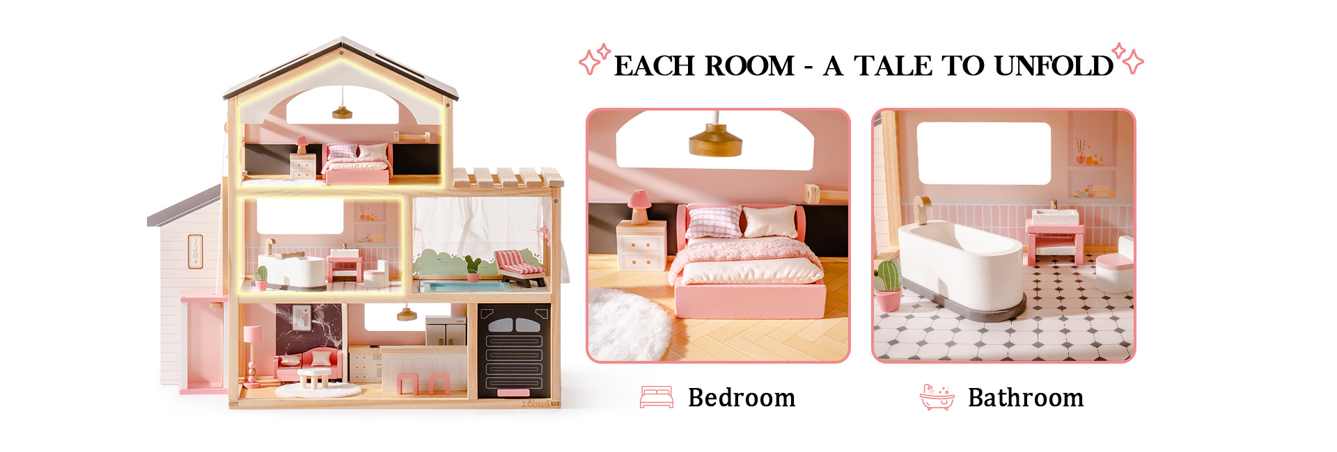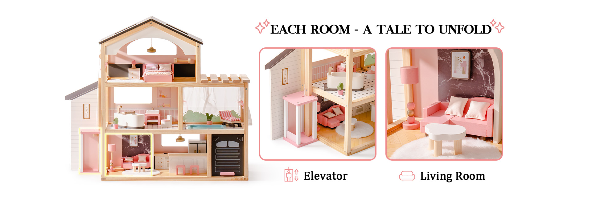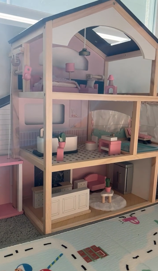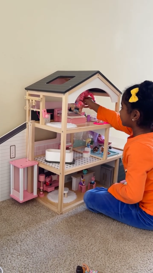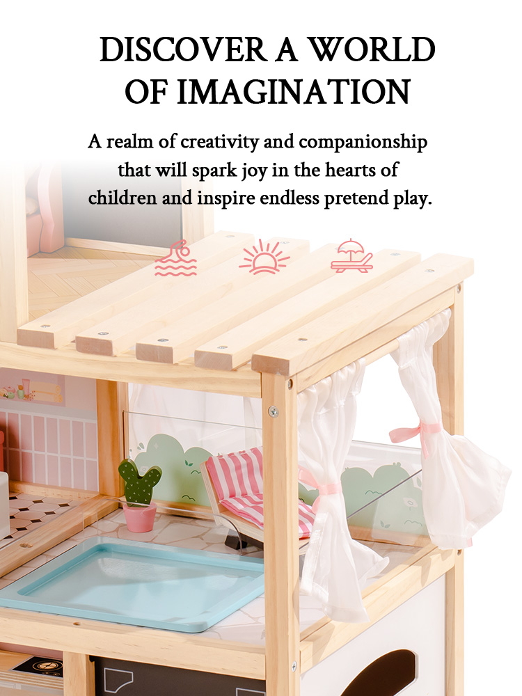 Paese delle meraviglie a tre livelli: La casa delle bambole è dotata di un ascensore funzionante e di un design a tre livelli con sei stanze, tra cui una camera da letto elegante e accogliente, un adorabile bagno, una comoda piscina, un soggiorno squisito, una cucina aperta e un garage. Questo allestimento completo abbraccia vari aspetti della vita quotidiana, ricreando scene di vita realistica. Attraverso il gioco, accende l'immaginazione infinita dei bambini e la curiosità per l'esplorazione.