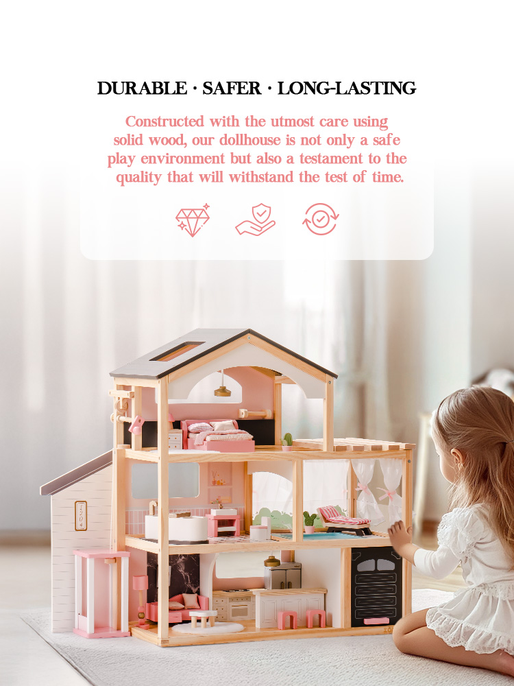 Dettagli realistici: Dalla progettazione intricata dei mobili ai delicati motivi della carta da parati, ogni dettaglio è curato con attenzione per creare un'atmosfera realistica. Le superfici lisce e prive di schegge dei mobili e degli accessori garantiscono sia eleganza che durata, aggiungendo sicurezza e qualità al tempo di gioco dei bambini.