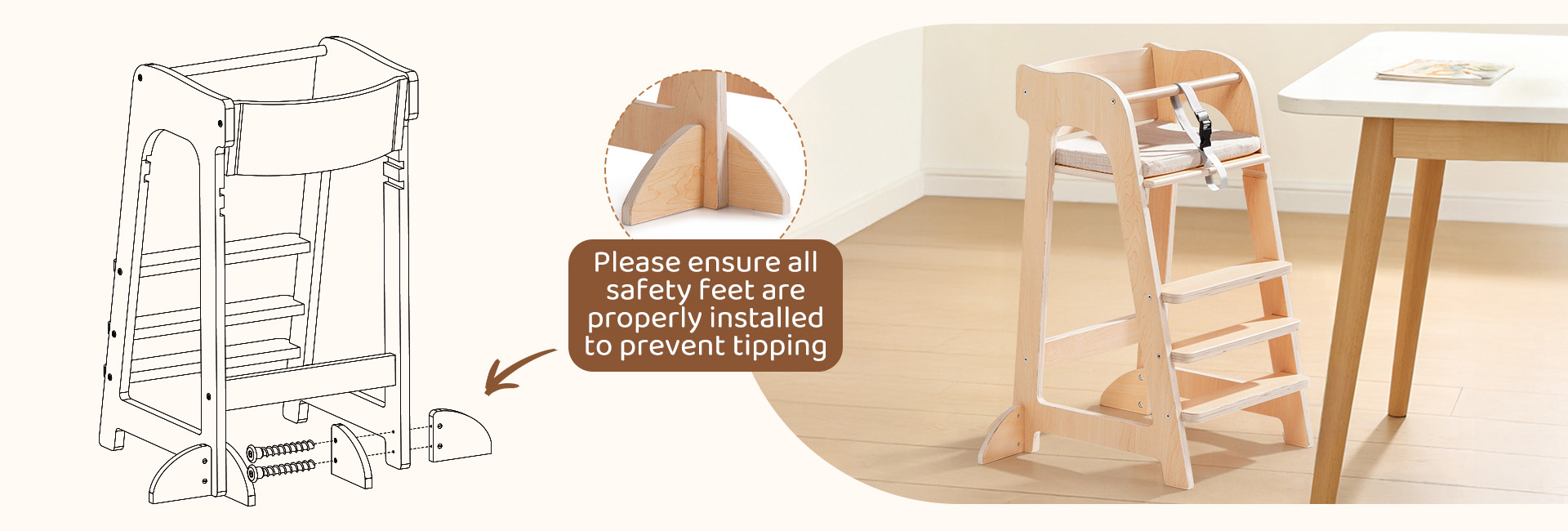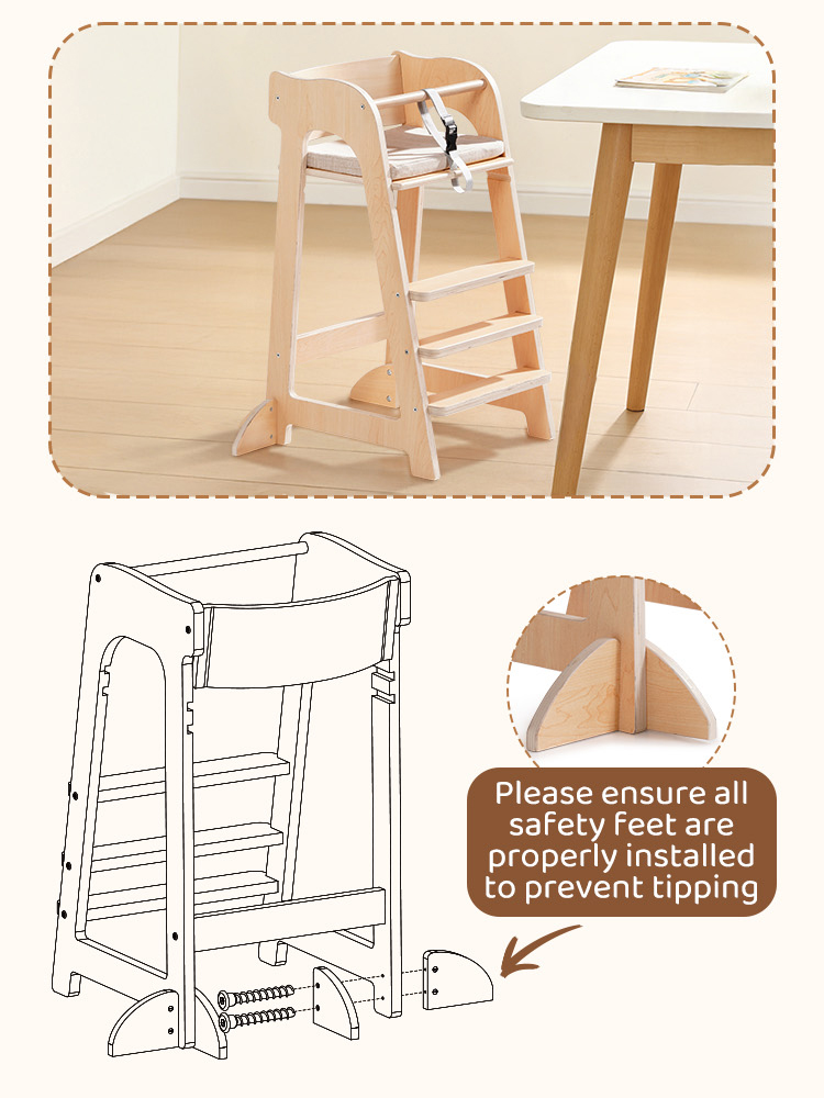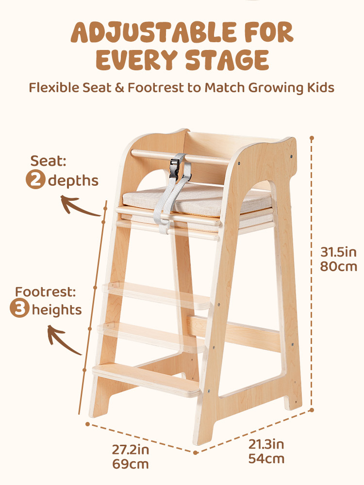 - Sedia ergonomica in legno multifunzionale: Più di una semplice sedia per la pappa, funge anche da scrivania o sedia da studio, aiutando i bambini a mantenere una postura seduta sana mentre favoriscono l'indipendenza. Lo schienale ergonomico e il poggiapiedi regolabile sono progettati con attenzione per promuovere una postura corretta e un comfort a lungo termine.