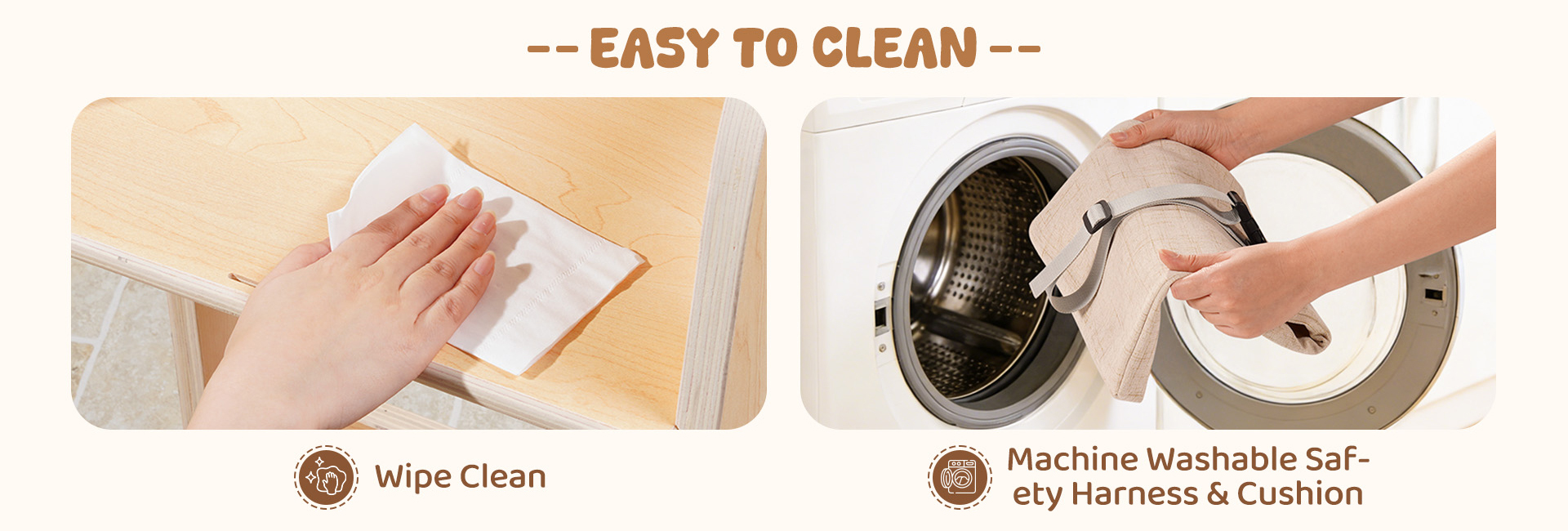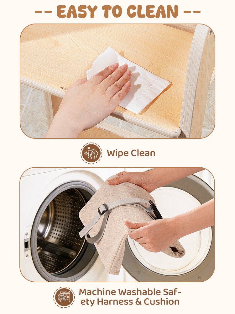 - Cuscino lavabile per un comfort migliorato: Include un cuscino morbido e rimovibile che aggiunge ulteriore comfort durante i pasti o il tempo di apprendimento. La fodera del cuscino è lavabile e la superficie della sedia può essere facilmente pulita con un panno umido, aiutando i genitori a mantenere l'area di seduta fresca, igienica e pronta per l'uso quotidiano.