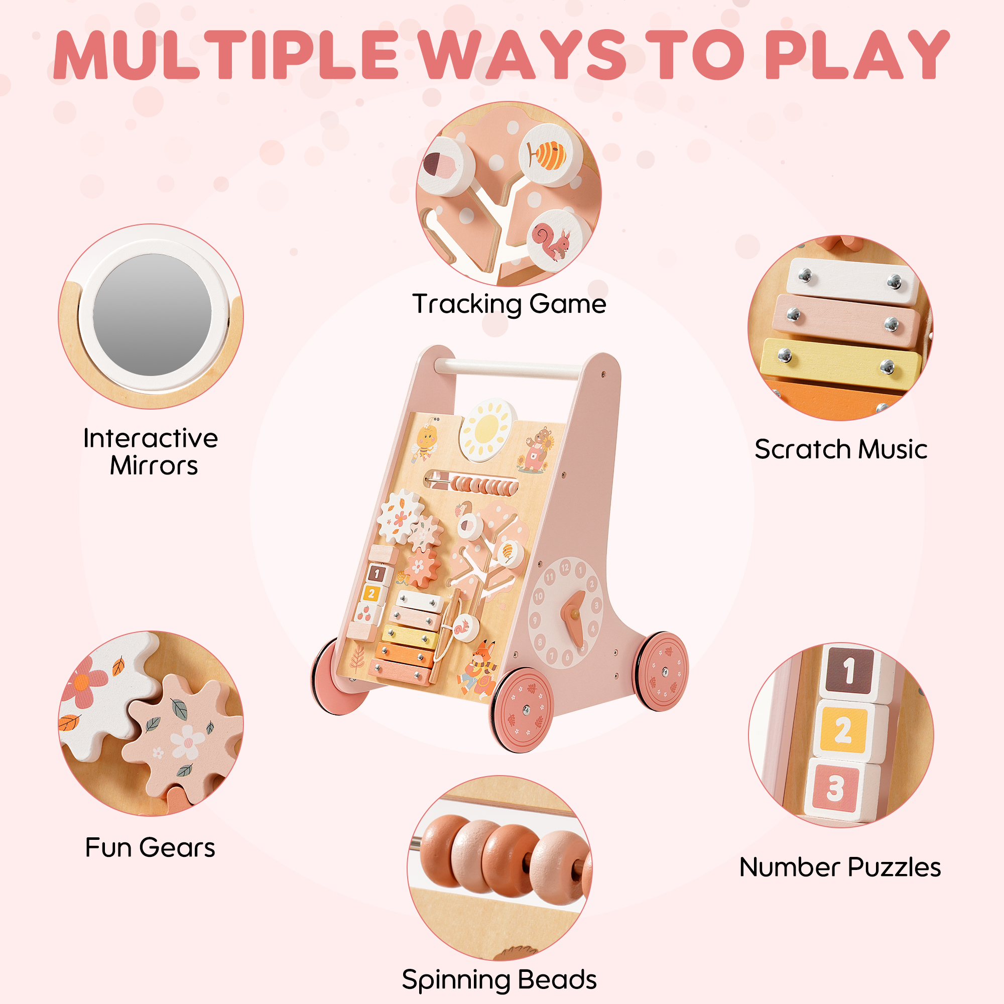 Gioca e Impara in Uno: Più di un semplice passeggino! Presenta uno specchio, perline, ingranaggi, xilofono, albero della saggezza, puzzle di forme, orologio e altro ancora. Questi elementi interattivi stimolano la curiosità, sviluppano le abilità motorie fini e incoraggiano l'apprendimento precoce, rendendo ogni passo un'avventura divertente!