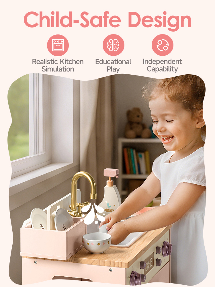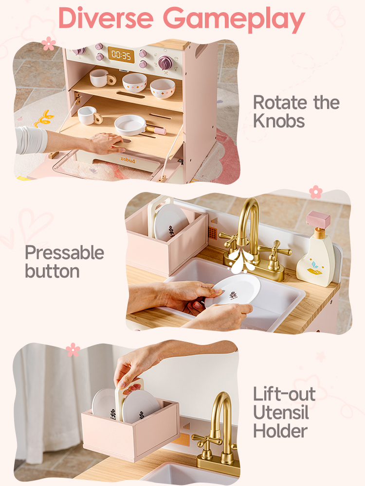 Design finemente lavorato: La lavastoviglie giocattolo ROBUD è infusa di artigianato squisito e creatività illimitata. Dall'aspetto carino alle funzioni realistiche, ogni dettaglio è stato accuratamente scolpito per far sentire i bambini alla moda e a loro agio mentre giocano.