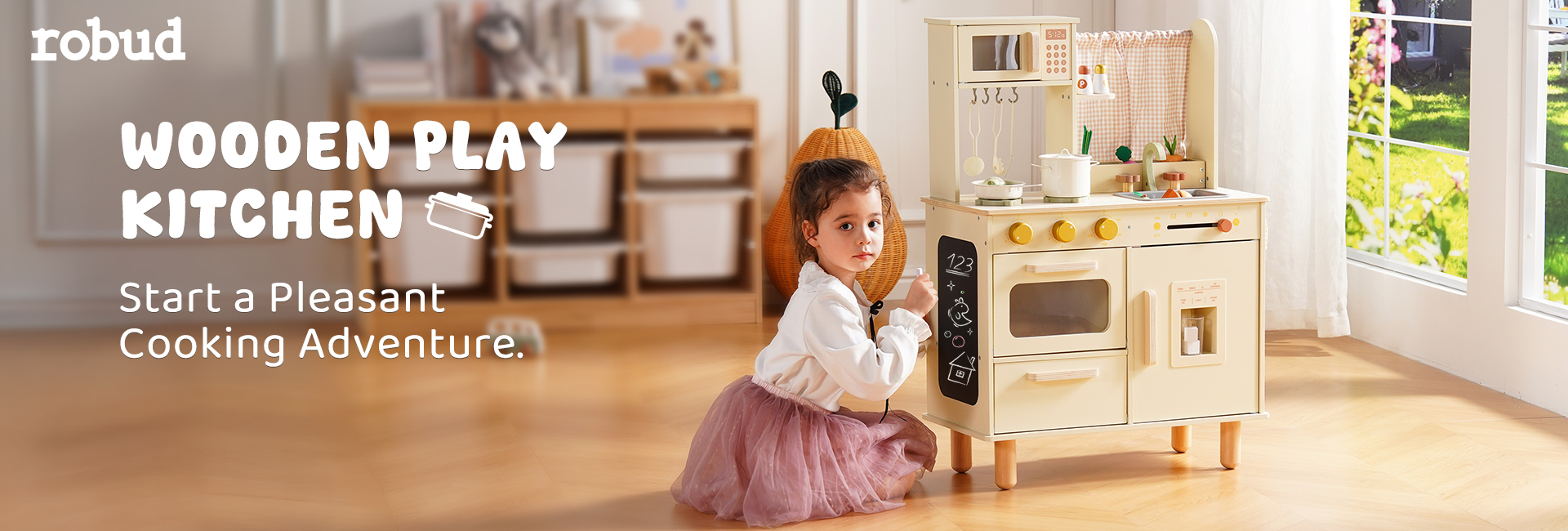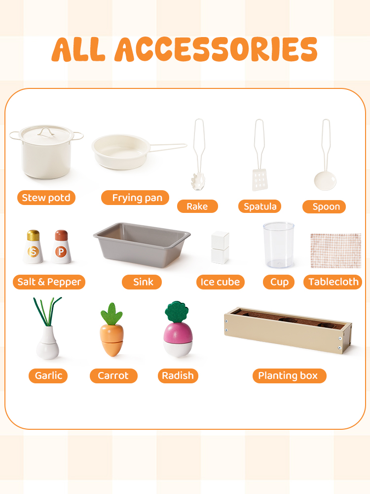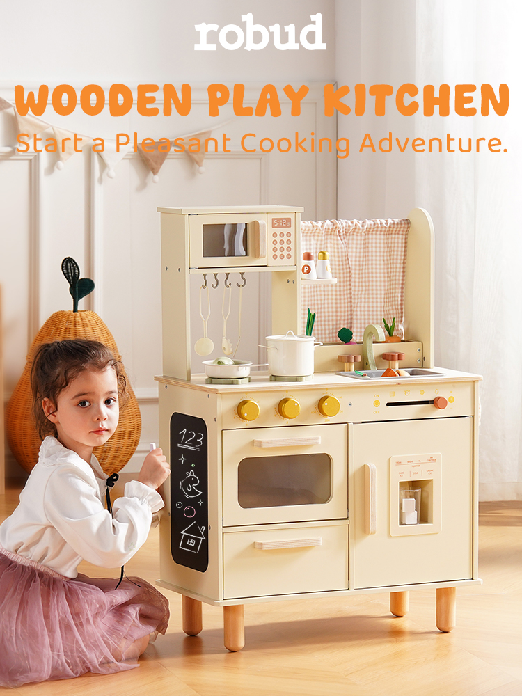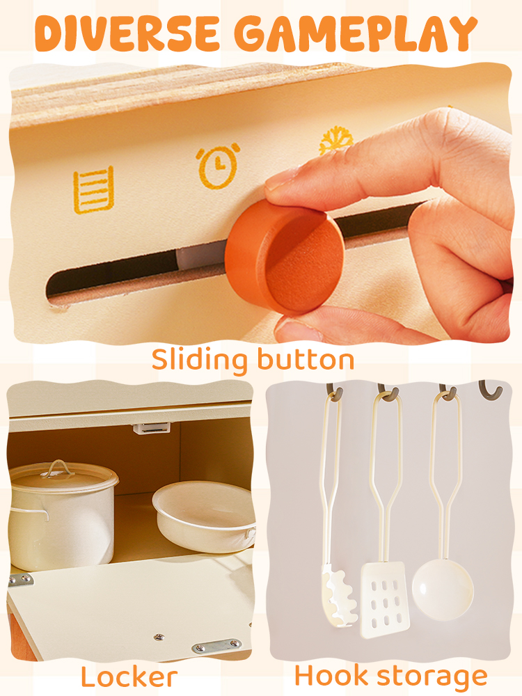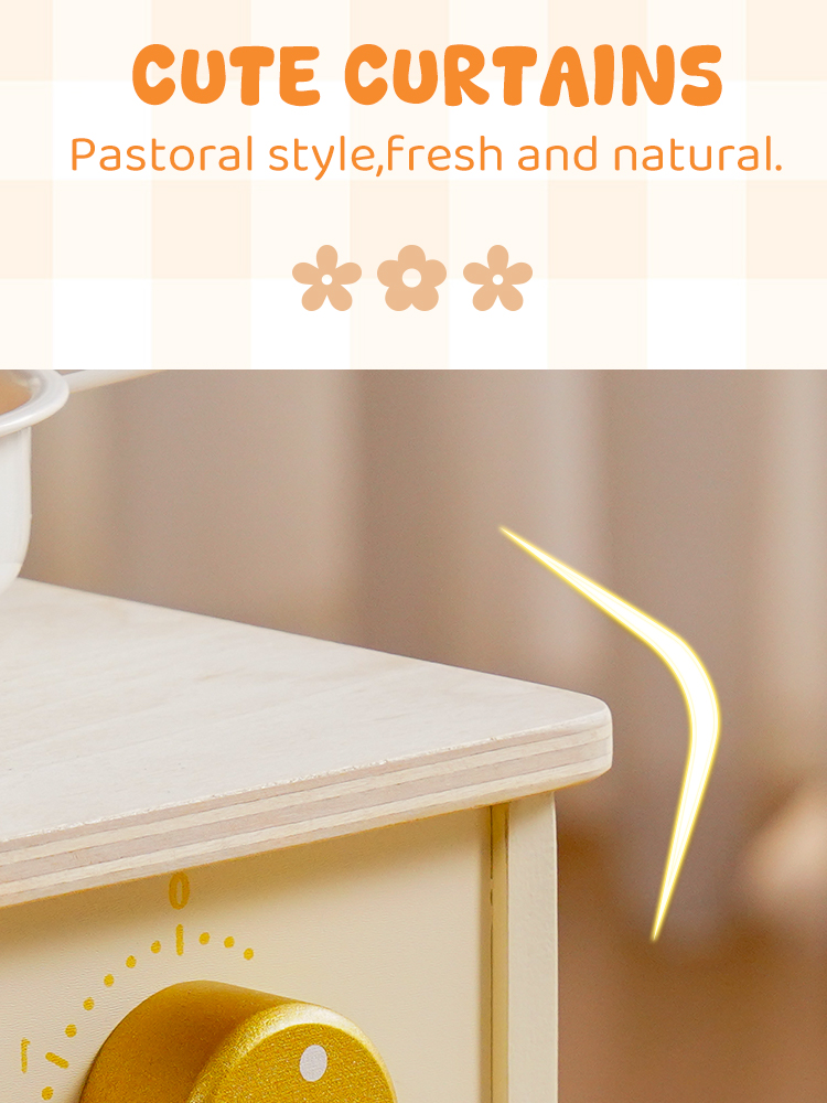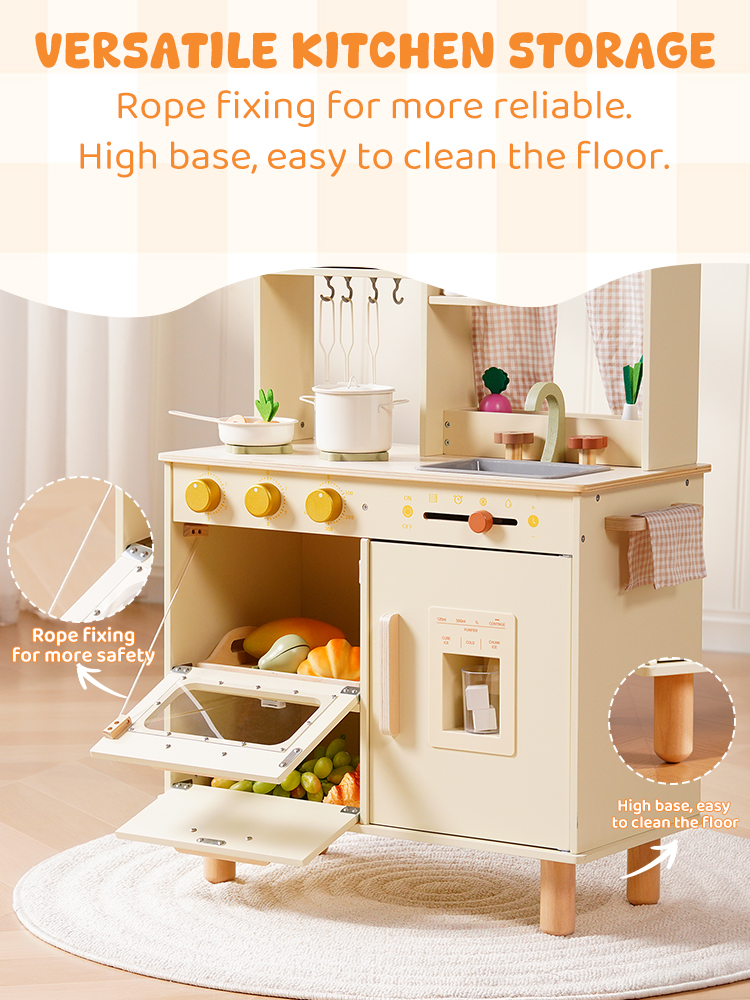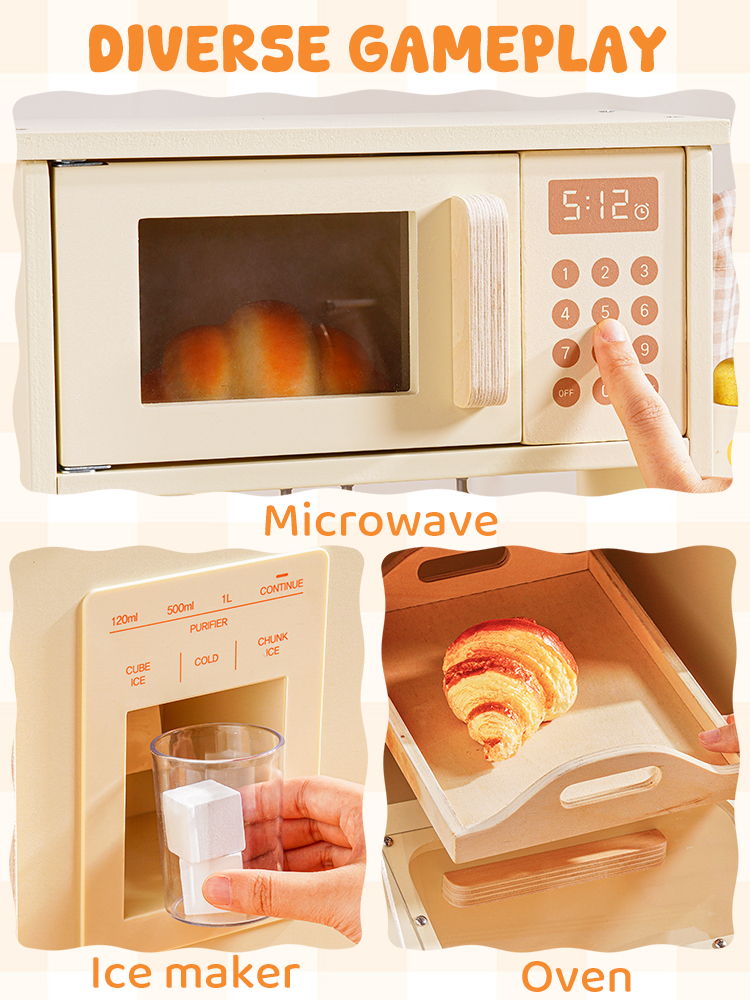 Questo set da cucina in legno per bambini include un forno a microonde, un lavello, un fornello e una macchina per il ghiaccio. Ogni dettaglio è meticolosamente progettato per ispirare l'immaginazione dei bambini, permettendo loro di simulare la cottura, la pulizia e il riordino proprio come i veri adulti. L'ampio spazio di archiviazione può contenere tutti gli accessori, aiutando i bambini a sviluppare l'abitudine al riordino. La cucina è dotata di pulsanti scorrevoli, manopole attivate da suoni, ripiani con ganci e persino una piccola lavagna, offrendo molteplici modi di giocare. I bambini possono usare le pentole, le padelle, gli utensili e il cibo finto inclusi per "cucinare", migliorando la coordinazione occhio-mano e le capacità motorie fini. Disponibile nei graziosi colori verde e crema, si abbina a graziose tende a scacchi e piccole verdure, aggiungendo un tocco di vivacità a qualsiasi stanza dei giochi.
