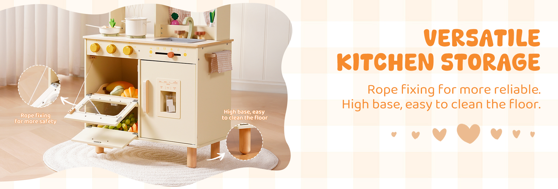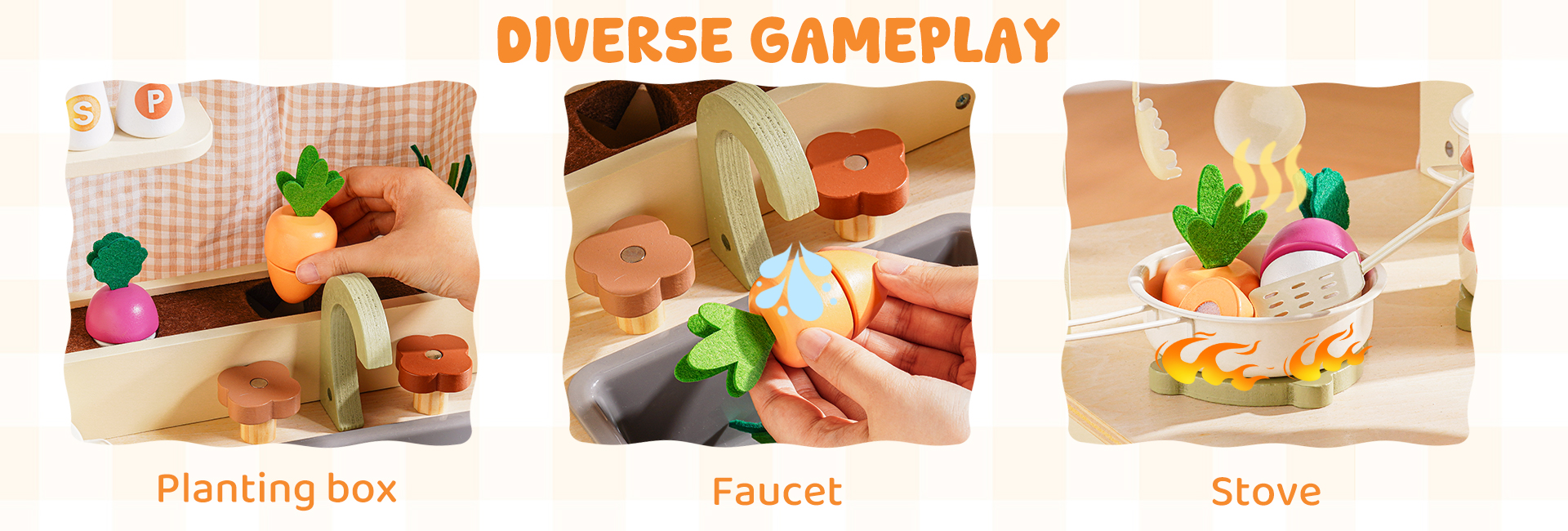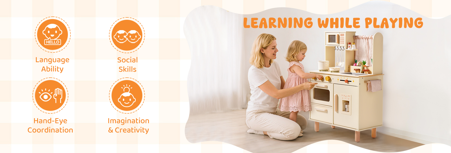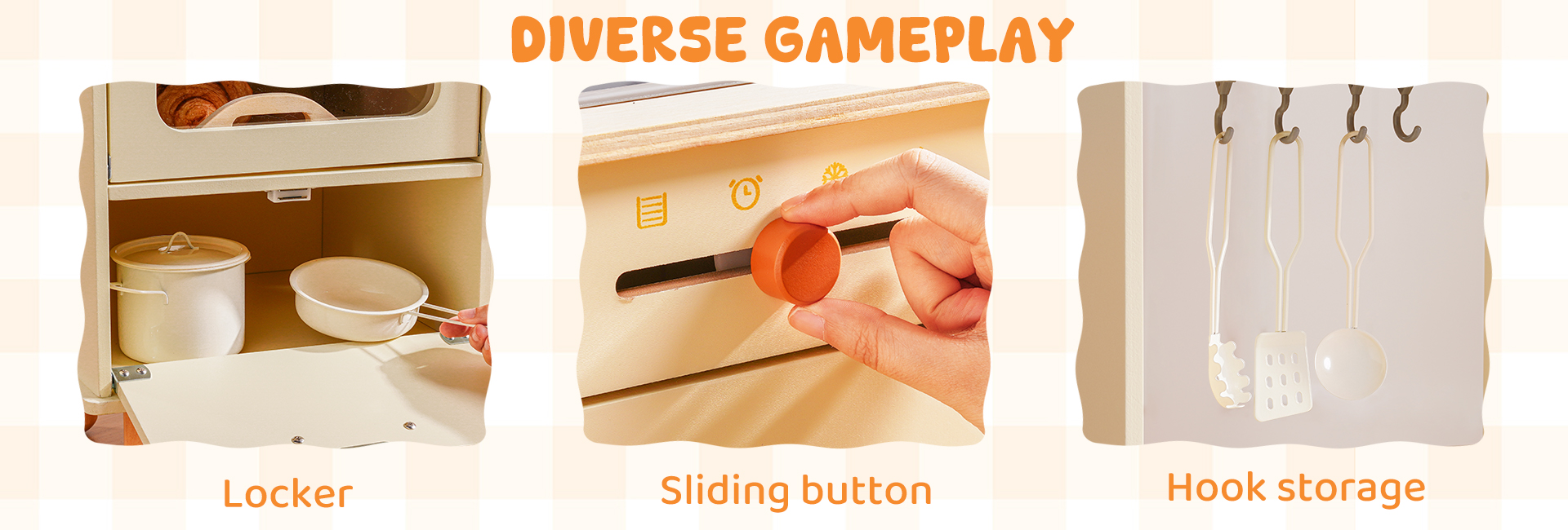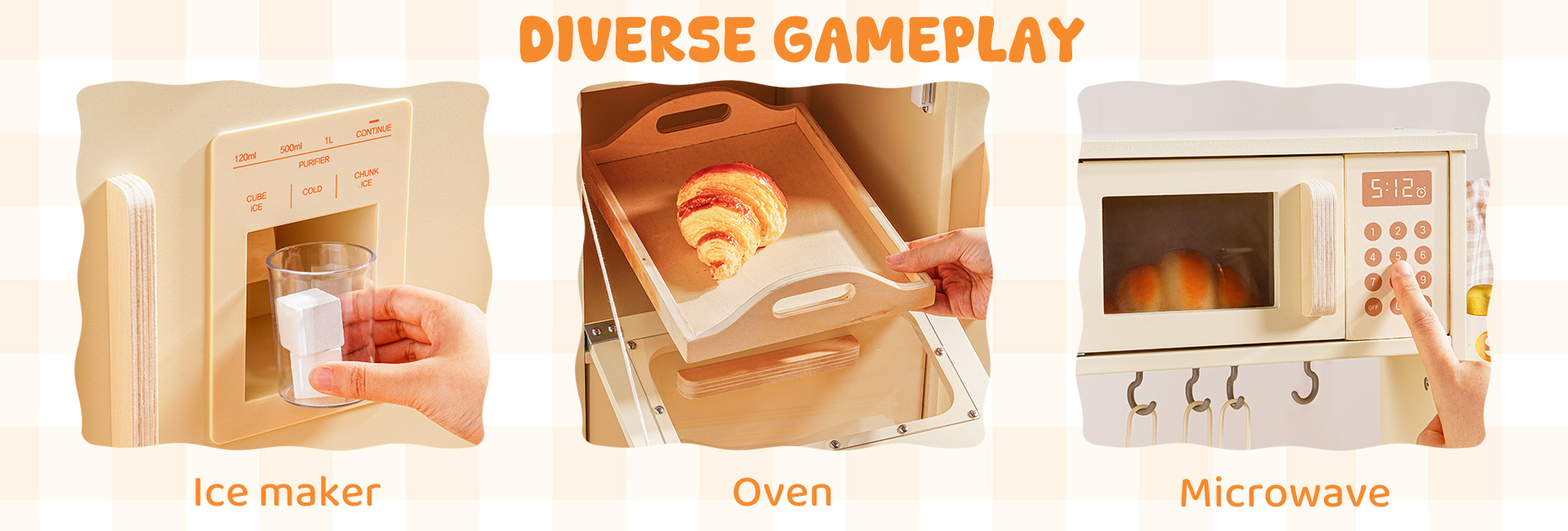 Questo set da cucina in legno per bambini include un forno a microonde, un lavello, un fornello e una macchina per il ghiaccio. Ogni dettaglio è meticolosamente progettato per ispirare l'immaginazione dei bambini, permettendo loro di simulare la cottura, la pulizia e il riordino proprio come i veri adulti. L'ampio spazio di archiviazione può contenere tutti gli accessori, aiutando i bambini a sviluppare l'abitudine al riordino. La cucina è dotata di pulsanti scorrevoli, manopole attivate da suoni, ripiani con ganci e persino una piccola lavagna, offrendo molteplici modi di giocare. I bambini possono usare le pentole, le padelle, gli utensili e il cibo finto inclusi per "cucinare", migliorando la coordinazione occhio-mano e le capacità motorie fini. Disponibile nei graziosi colori verde e crema, si abbina a graziose tende a scacchi e piccole verdure, aggiungendo un tocco di vivacità a qualsiasi stanza dei giochi.