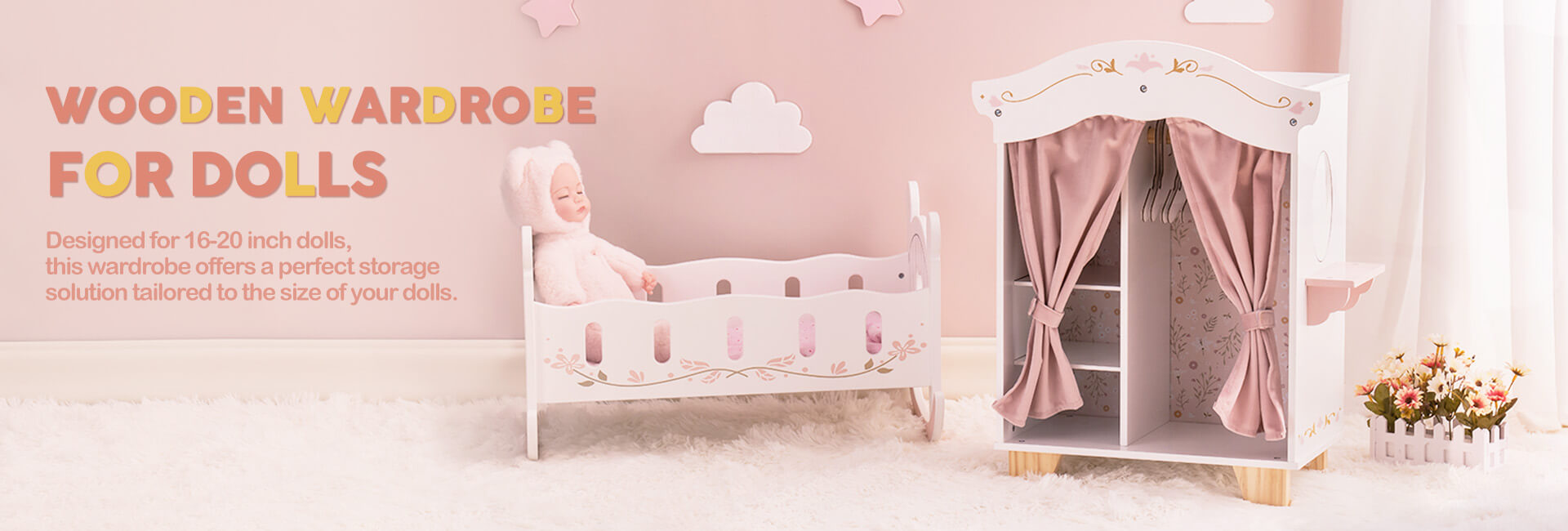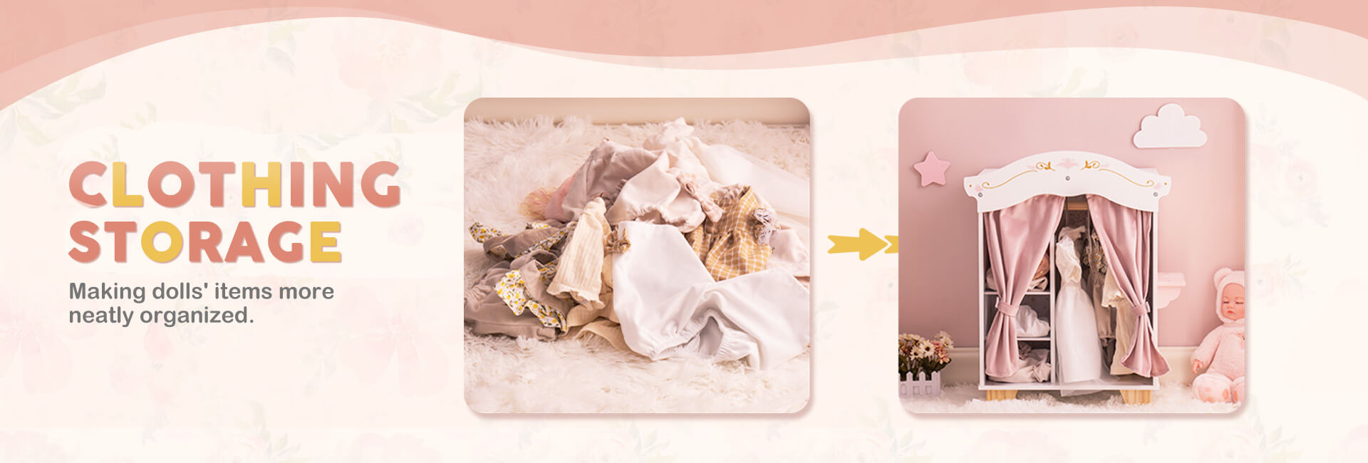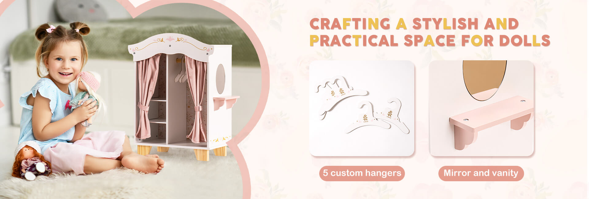 ESPERIENZA INTERATTIVA: Non è solo un armadio; è un regno di divertimento per i bambini. Con piccoli specchi delicatamente progettati e un adorabile vanità sul lato, l'armadio per bambole offre ai bambini la gioia del gioco interattivo mentre organizzano i loro vestiti.